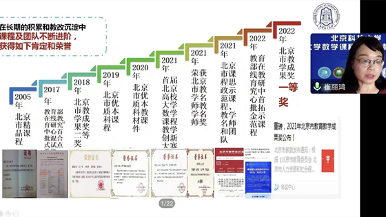 金沙集团wwW3354CC教授、北京市课程思政教学名师朱婧,同济大学数学科学学院教授、博士生导师熊革,同济大学名课优师、分析类课程链课程思政项目负责人周羚君,北京化工大学教授、北京市教学名师崔丽鸿,结合自己多年教学经验,先后分享了《数学模型》课程思政建设探索与实践、大学生创新思维的引领、如何激发学生对数学的兴趣、《线性代数》课程思政建设的探索与实践等相关成果及体会。
